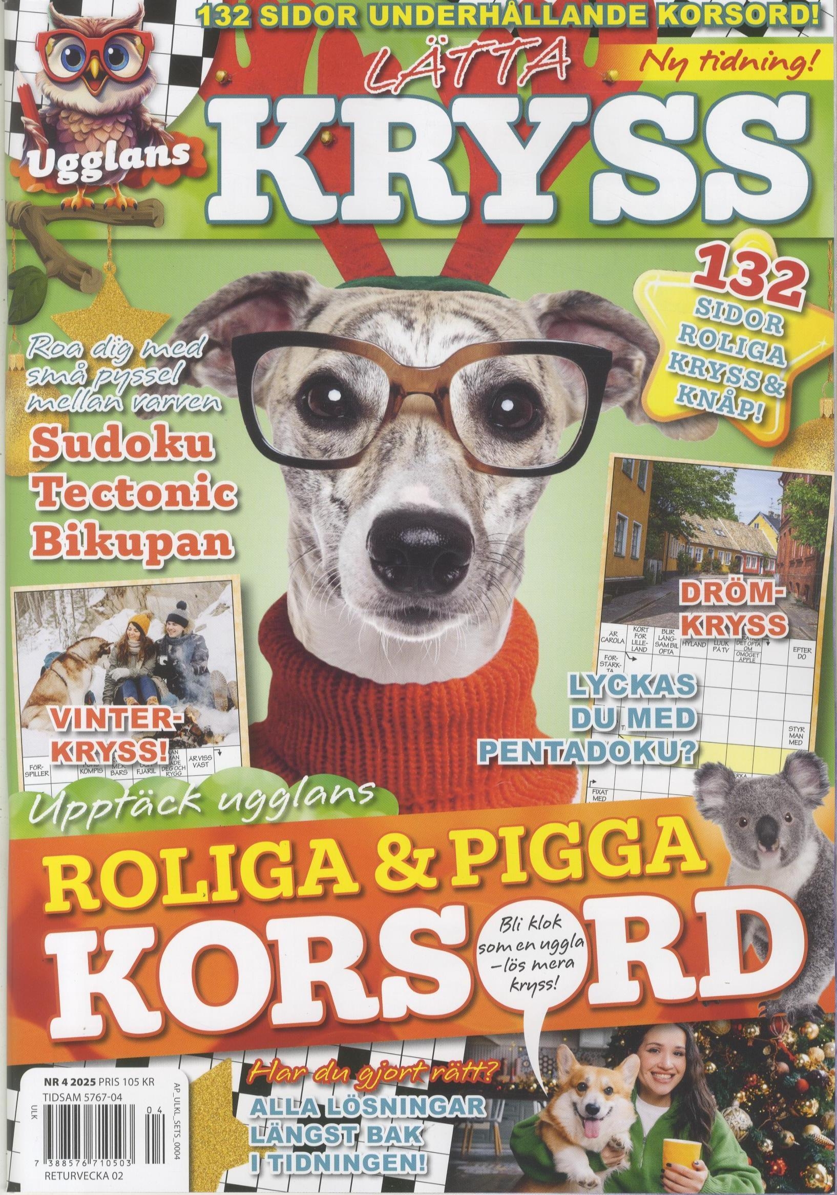 Vem vill inte vara klok som en Uggla? Nu kommer uppstickaren Ugglan med en ny välfylld korsordstidning på lätt nivå. Utöver kryss och korsord finns här även en mix av sudoku, tectonic och olika små pyssel som håller hjärnan pigg alla dagar.